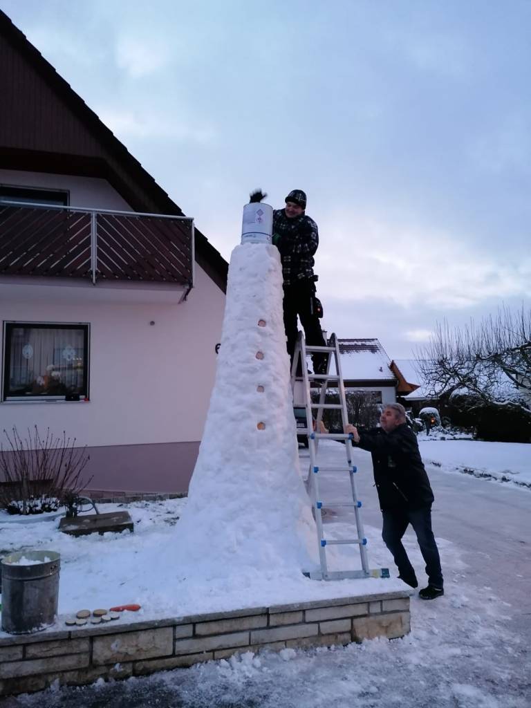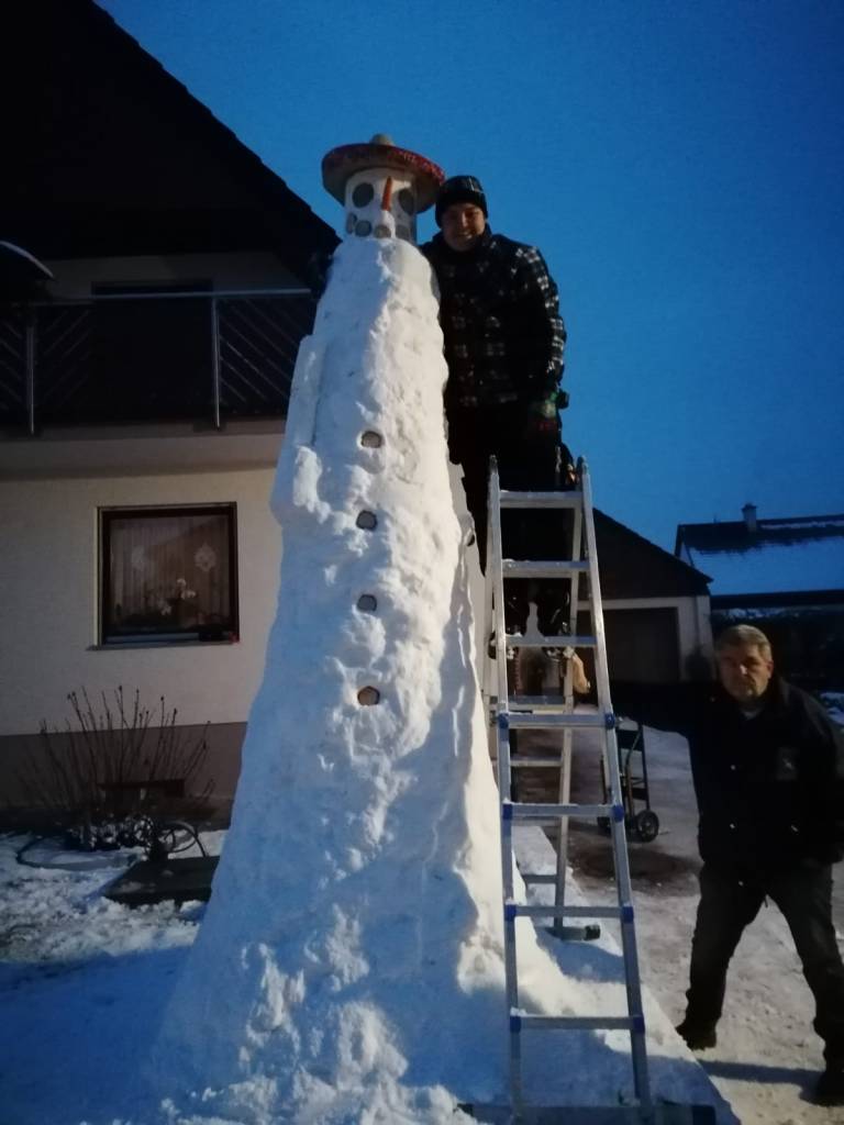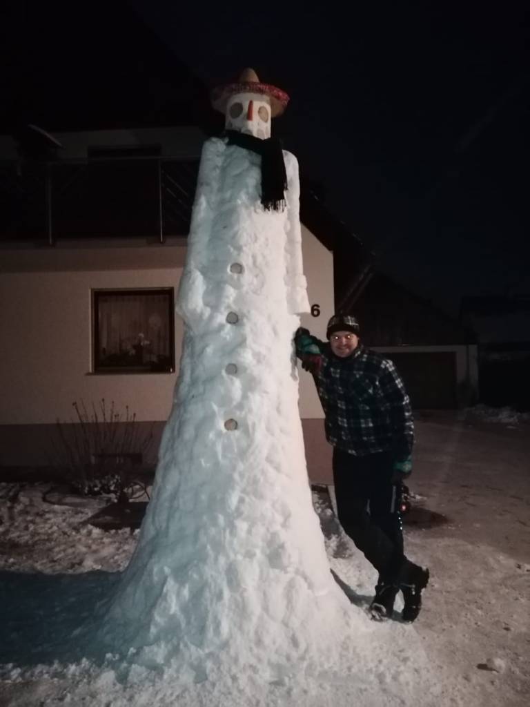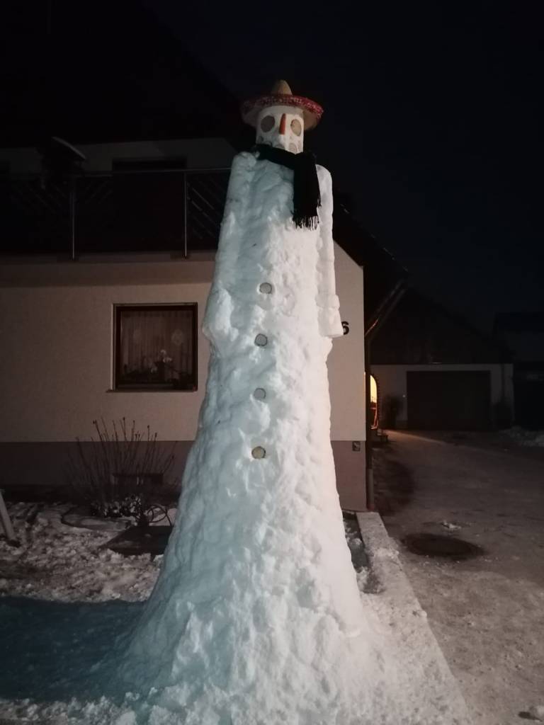 Diesen etwa 3,6 Meter hohen Schneemann hat Kai Blumenstock vor seinem Elternhaus im Januar 2021 gebaut. Dabei halfen Nachbarn sehr fleißig mit. Leider fiel der Koloss schon einige Tage später dem Regen zum Opfer. Kai Blumenstock hat aber bereits angekündigt, dass er beim nächsten großen Schneefall einen noch größeren weißen Riesen erschaffen will. Damit will er zeigen, dass man nie zu alt ist, um sich am Schnee zu erfreuen.
